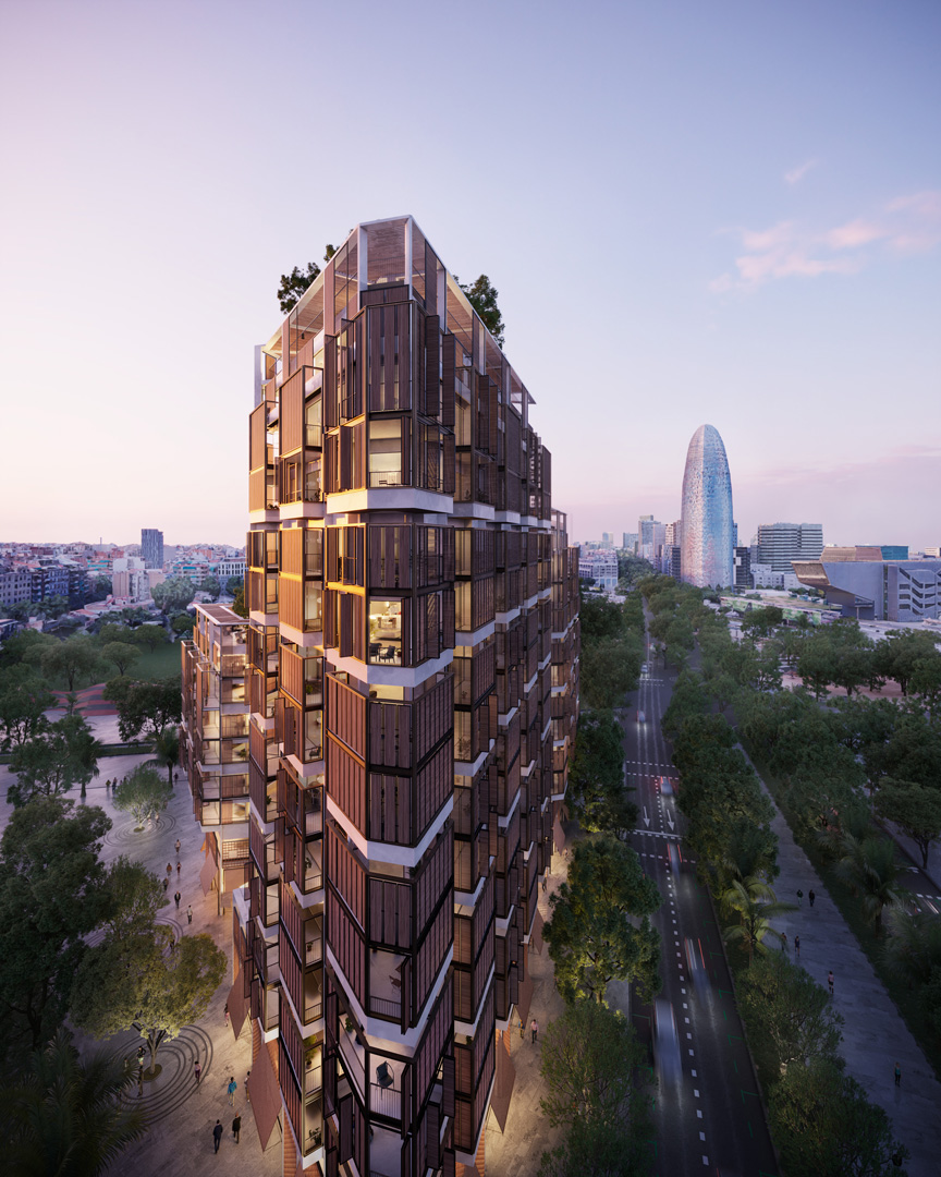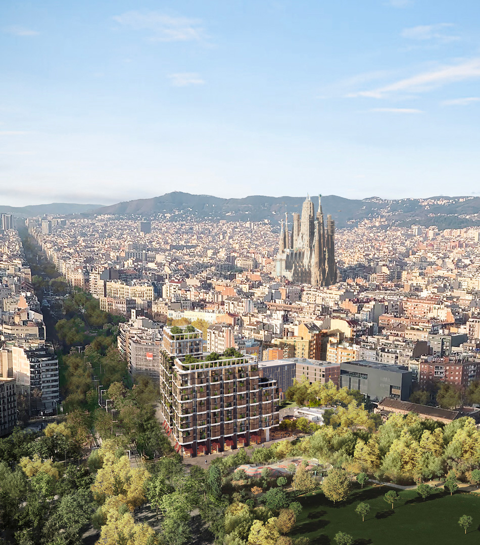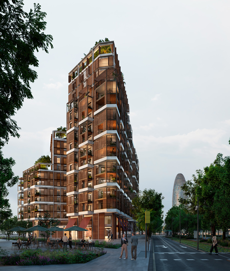 Donde el Eixample y la Avenida Diagonal se integran en la Plaza Glòries frente al pulmón verde del Parque Clariana.